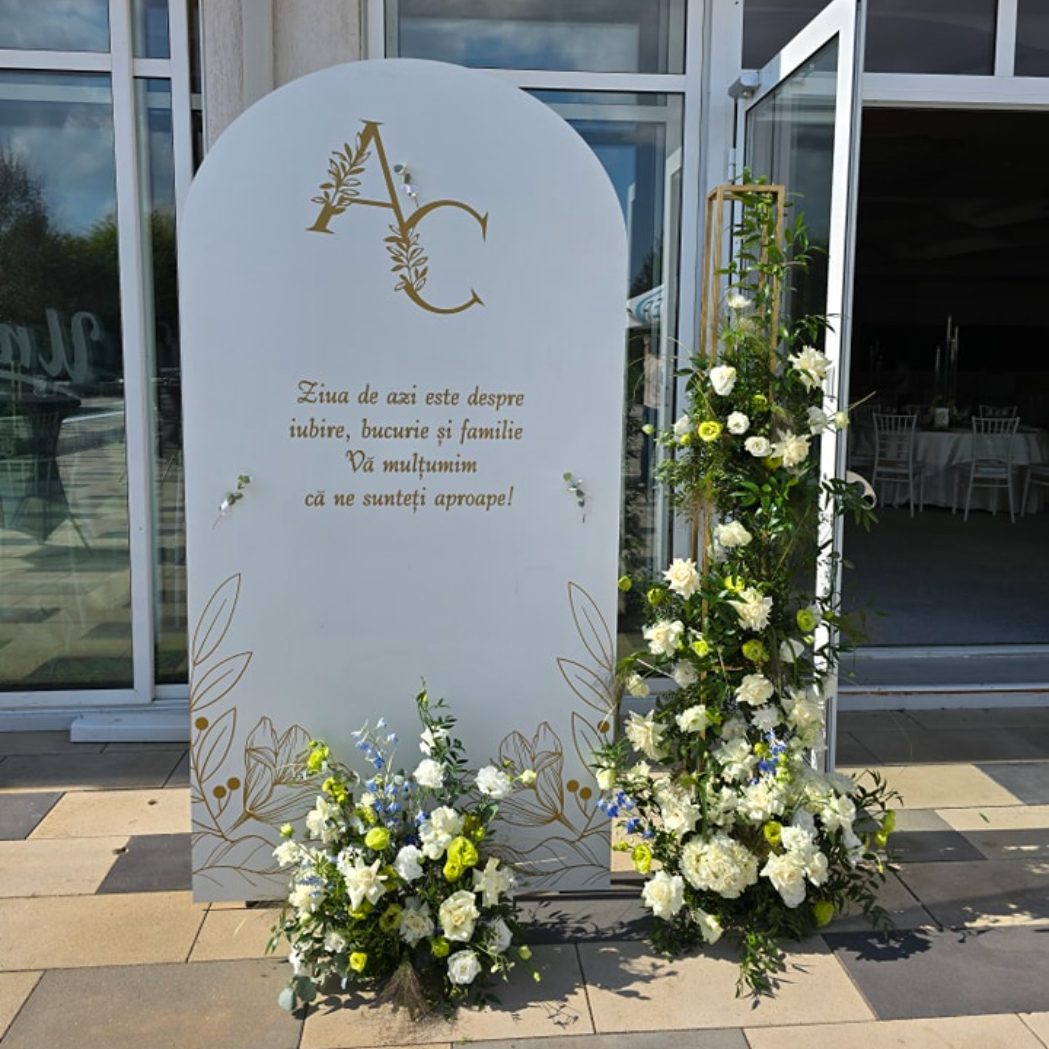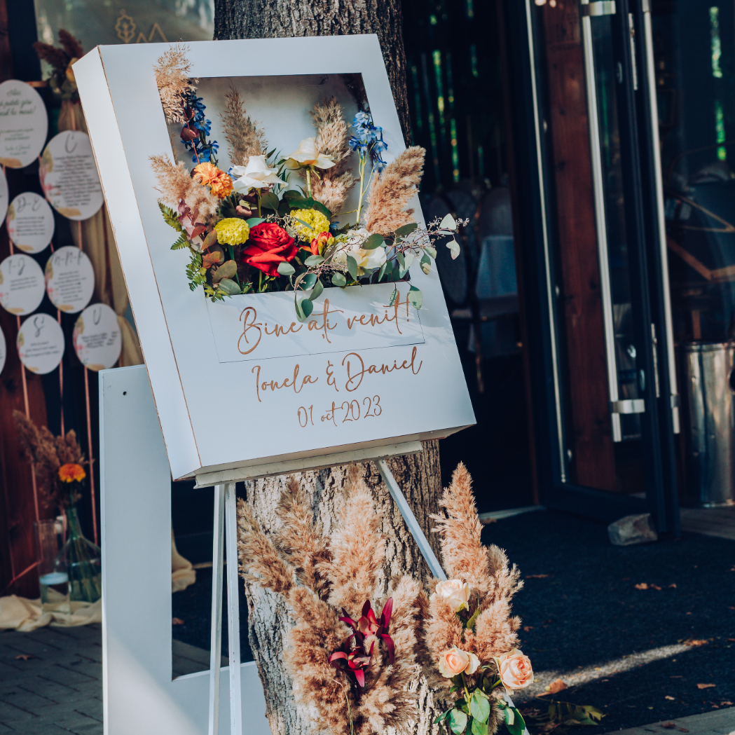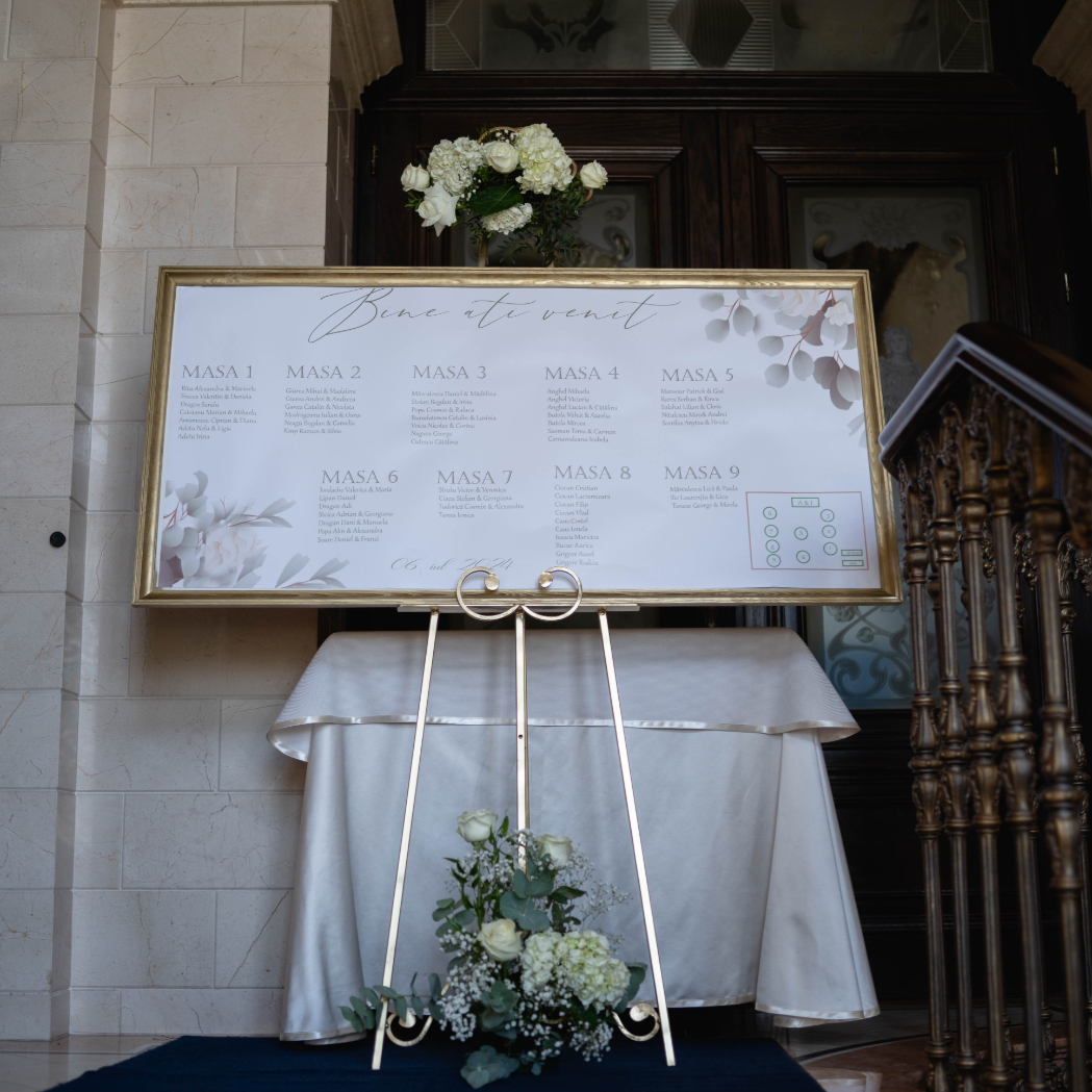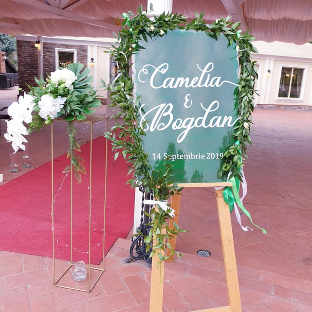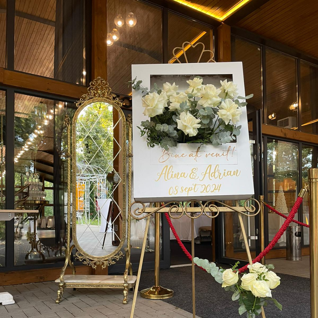 O oglindă mare, delicat înfrumusețată cu flori naturale sau elemente tematice, poate reflecta perfect stilul evenimentului, devenind un punct de atracție vizual. Alături, un stand cu mesaje de bun venit sau un panou personalizat va capta privirile, setând tonul sofisticat al ceremoniei.