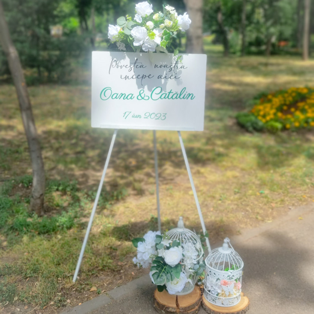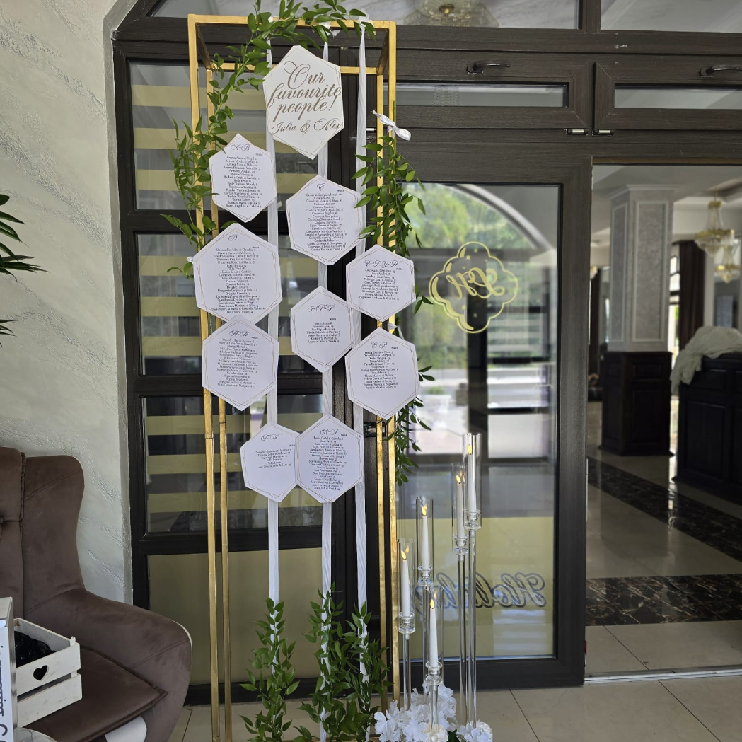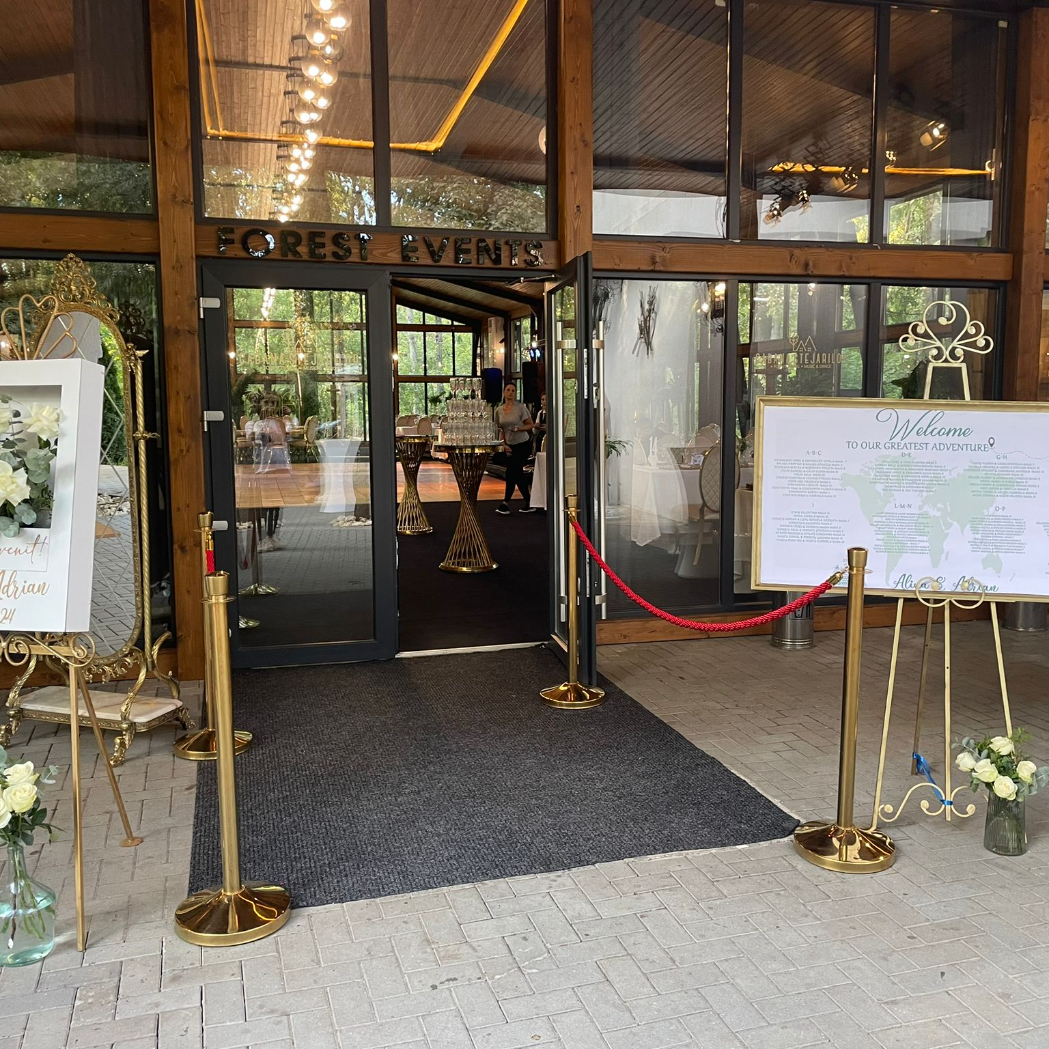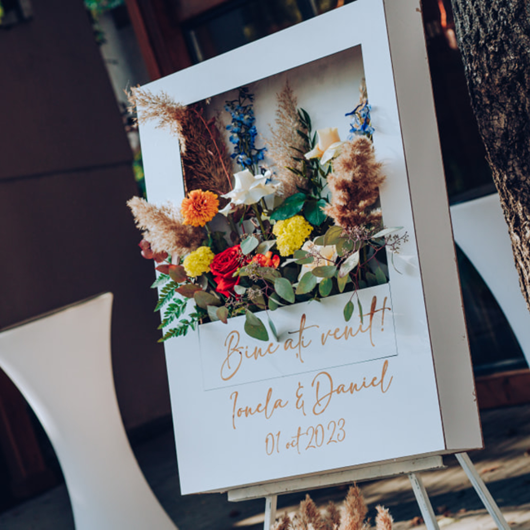 O oglindă mare, delicat înfrumusețată cu flori naturale sau elemente tematice, poate reflecta perfect stilul evenimentului, devenind un punct de atracție vizual. Alături, un stand cu mesaje de bun venit sau un panou personalizat va capta privirile, setând tonul sofisticat al ceremoniei.