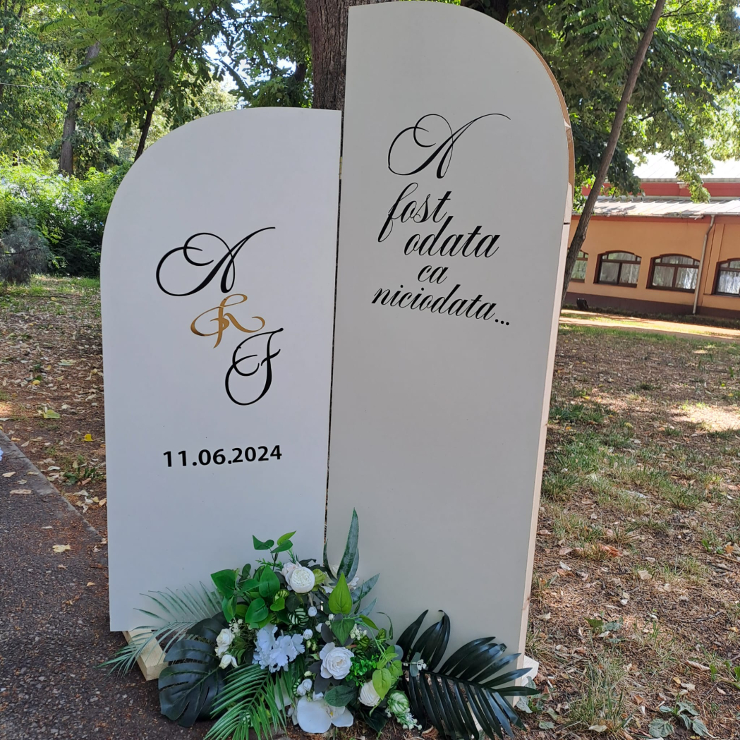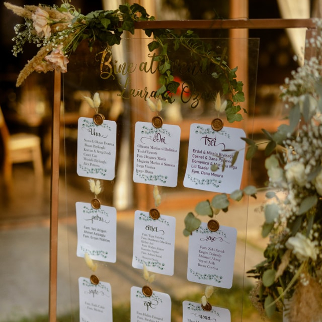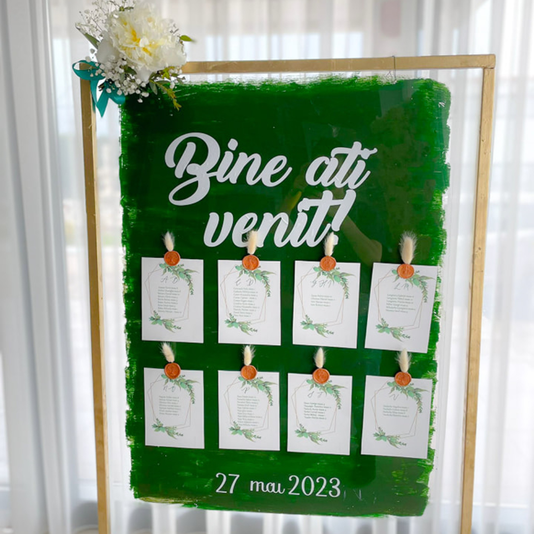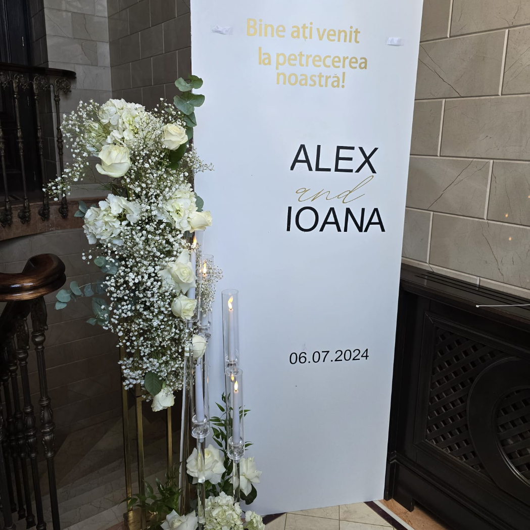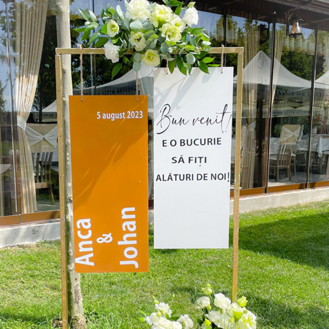 O oglindă mare, delicat înfrumusețată cu flori naturale sau elemente tematice, poate reflecta perfect stilul evenimentului, devenind un punct de atracție vizual. Alături, un stand cu mesaje de bun venit sau un panou personalizat va capta privirile, setând tonul sofisticat al ceremoniei.