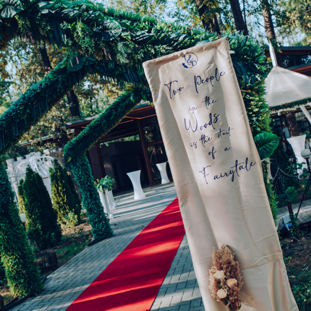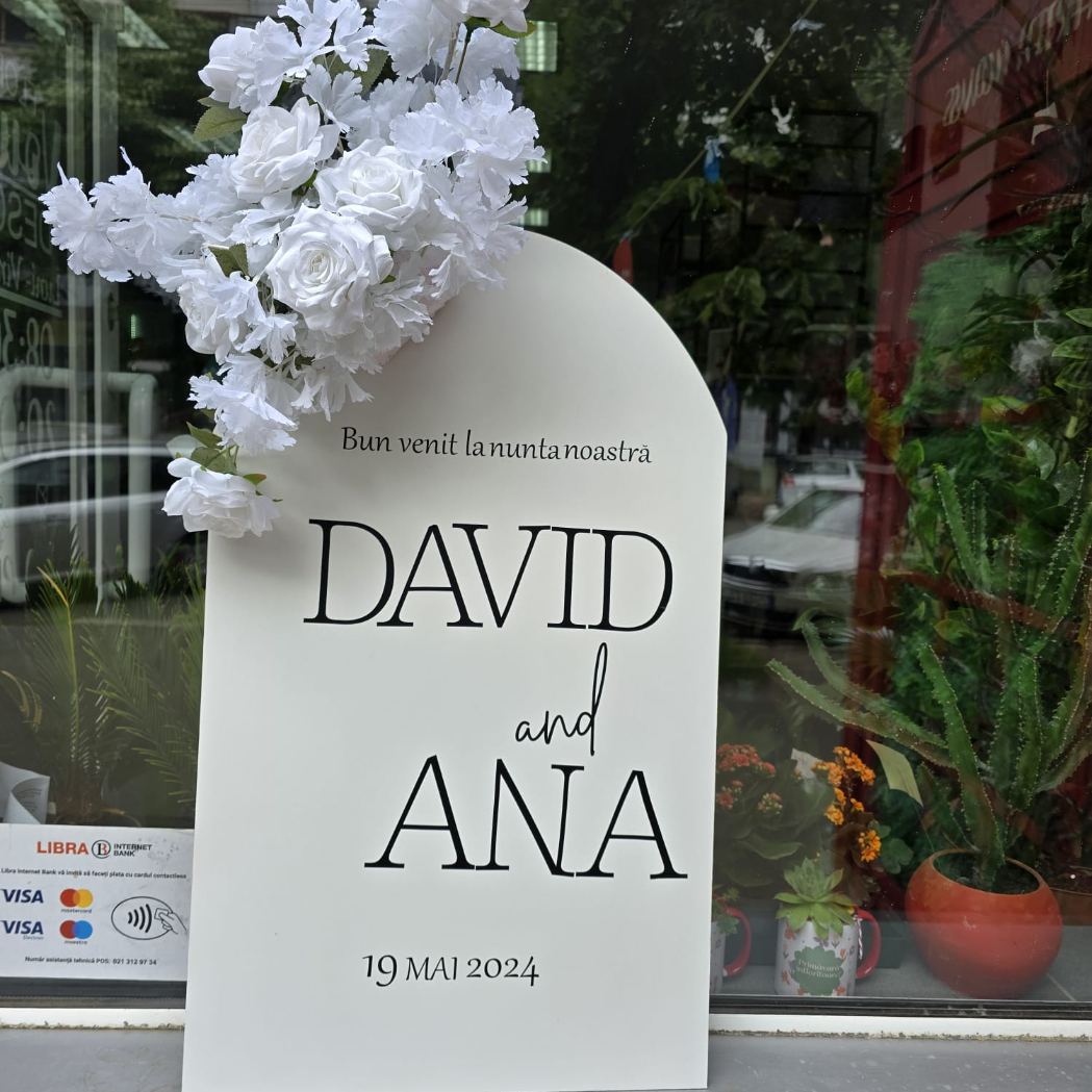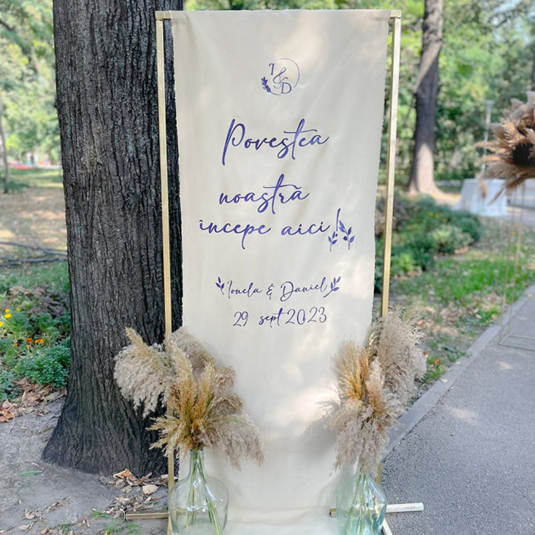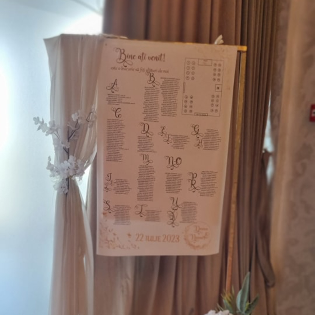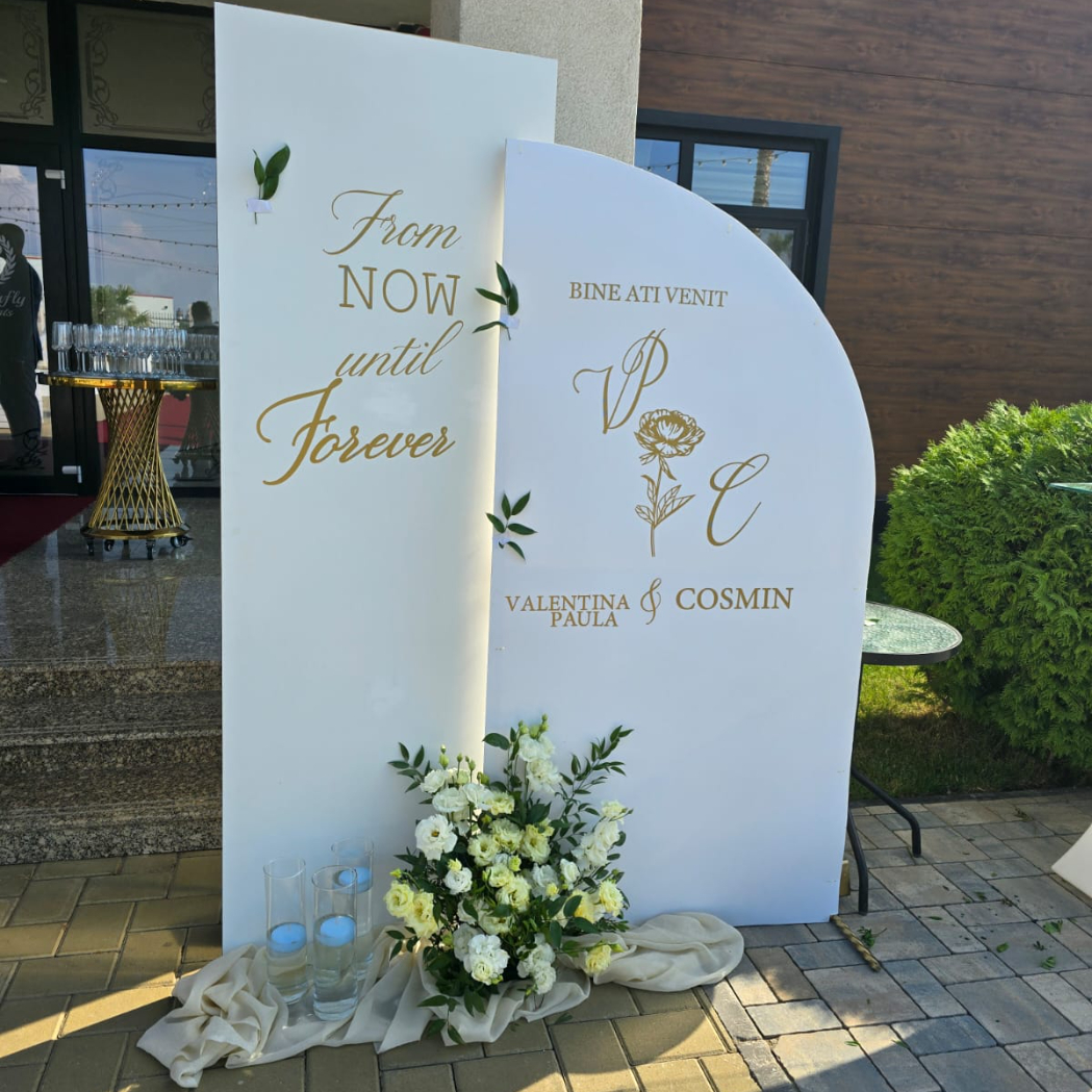 O oglindă mare, delicat înfrumusețată cu flori naturale sau elemente tematice, poate reflecta perfect stilul evenimentului, devenind un punct de atracție vizual. Alături, un stand cu mesaje de bun venit sau un panou personalizat va capta privirile, setând tonul sofisticat al ceremoniei.