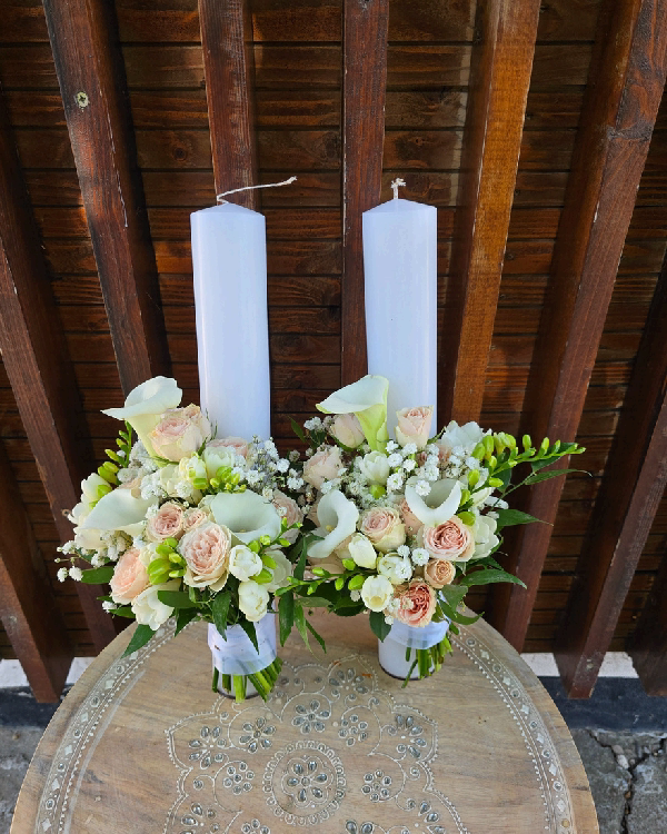 Include un buchet de mireasă delicat, un buchet pentru nașă, o pereche de lumânări și două cocarde,